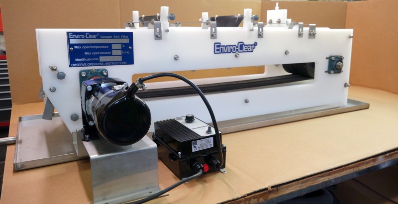 The Enviro-Clear® HBVF Pilot Unit is used for continuous pilot scale filtration and washing by incorporating production systems as pilot plants.The 3 square foot HBVF Pilot Unit comes complete with a skid mounted vacuum pump, filtrate receivers with pumps, control panel and several filter cloths. Equipment necessary for up to three filter cake washes can be provided. In order to determine optimum performance parameters, the unit can be operated at different vacuum levels and belt speeds. The form, wash and drying zones’ lengths can be varied with adjustable vacuum box dividers that are provided.