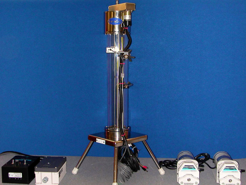 The interface between sludge bed and clarified liquid zone is located by an infrared sensing system which controls the underflow pump. The entrance velocity can also be varied for determination of optimal conditions. The Clarifier/Thickener is designed so that it can be adjusted while it is running and so that it can be taken apart easily and quickly. It can be supplied in two aluminum carrying cases. The unit handles feed flow rates in the range of 50-1500 ml/minute.
